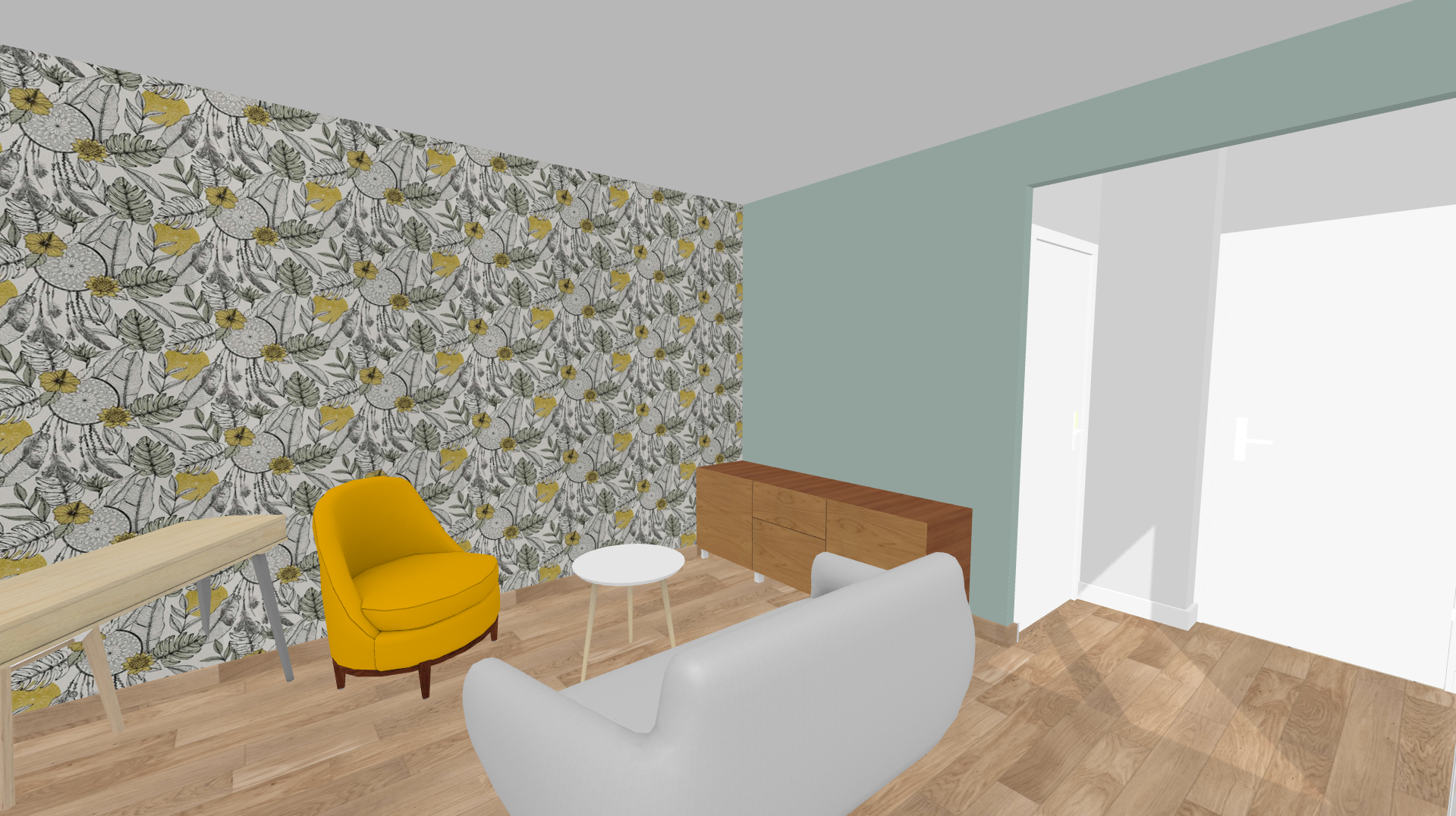 Ainsi une complémentarité de jaune moutarde et de vert d’eau dans le salon ainsi que le maintien des matières « bois » et des formes arrondies, ont permis de recréer un dynamisme dans cette pièce qui représentait les domaines des relations et de l’amour.